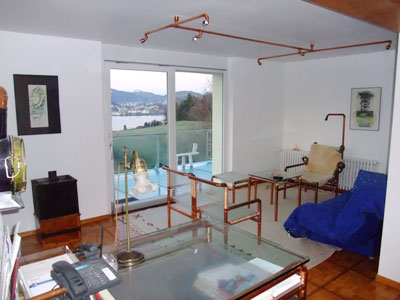 Es entstanden: Schreibtisch mit Synthesizer-Rack, Clubtisch mit 2 -Stühlen und Grosi-Lese-Liege, kleines und grosses Gestell, Garderobe und Esstisch mit 8 Stühlen.